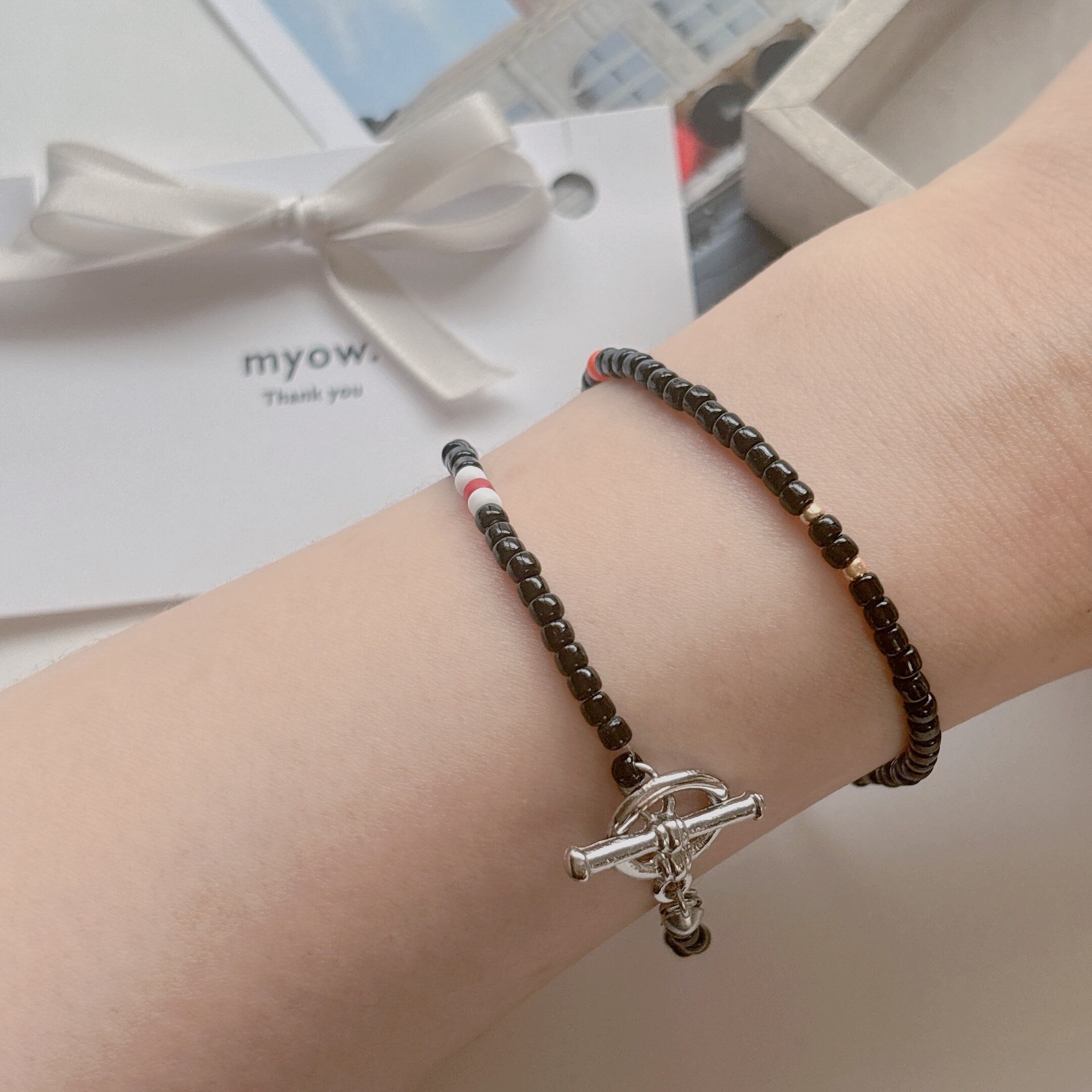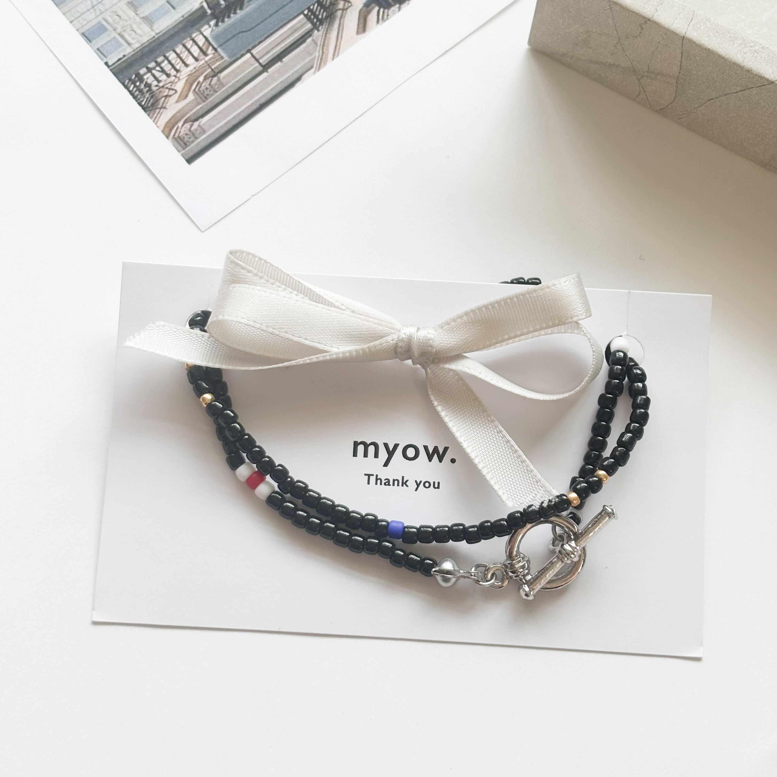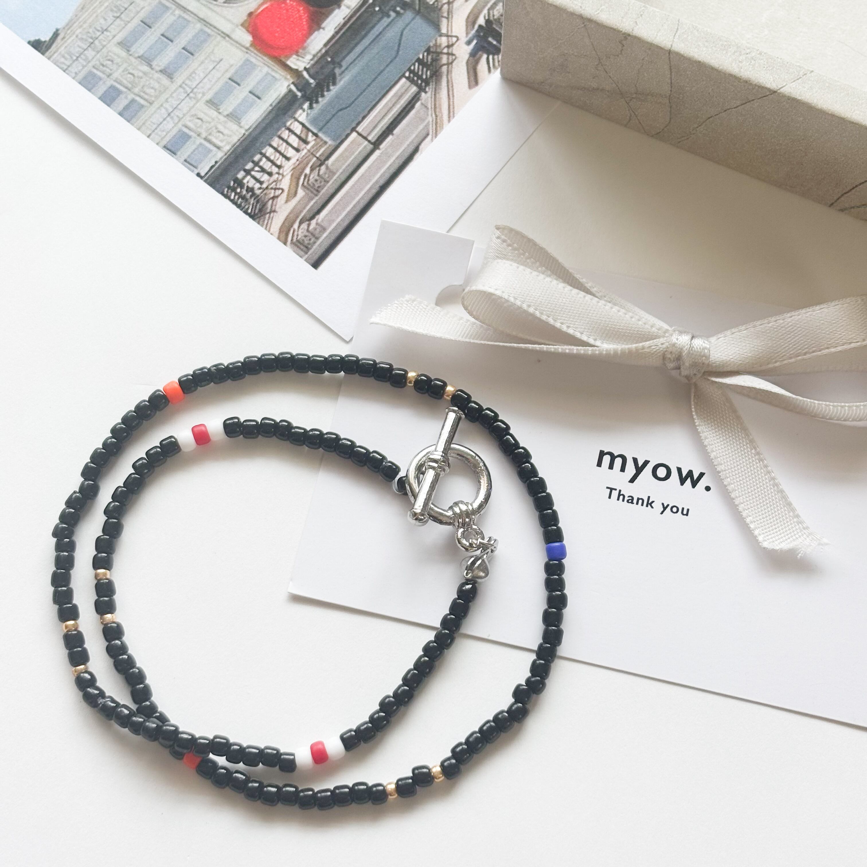 黒いビーズに赤、青、白、ゴールドのアクセントが際立つ
